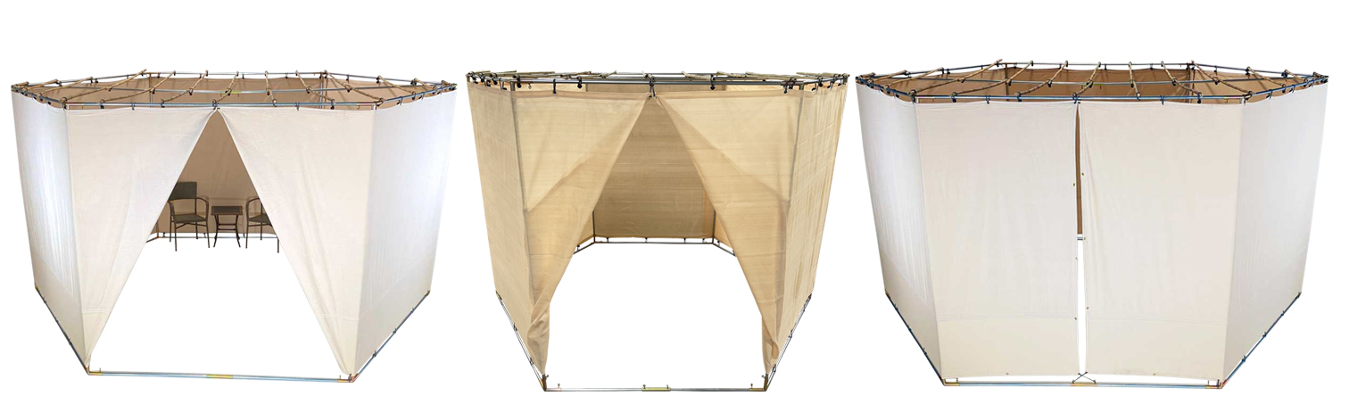 Our unique six-sided sukkah kit is a hexagonal sukkah built with strong yet lightweight steel tubing. With this non-rectangular space you’ll have a sukkah like no one else on your block! The frame connects together with special steel fittings which require no tools at all. The included SukkahScreen™ or canvas wall tarps are then wrapped around the frame and affixed top and bottom with bungee loops. Six-sided sukkah kits include pre-cut lengths of steel tubing, steel connectors, wall material (with attachment bungees), bamboo roof support slats (with attachment bungees) and instructions—everything you need to build a complete sukkah except the s’chach, which can be gathered locally (we do not have s’chach mats cut to fit the hexagonally-shaped Six-Sided Sukkah; contact us for ideas on how to cover the roof). The six-sided sukkah kit is available in two sizes—the larger size has 8′ wide walls (total footprint ~13.5’x16′) and the smaller size has 6′ wide walls (total footprint ~10’x12′). All Tubular Sukkah Kits include free stakes and sandbags for wind protection.