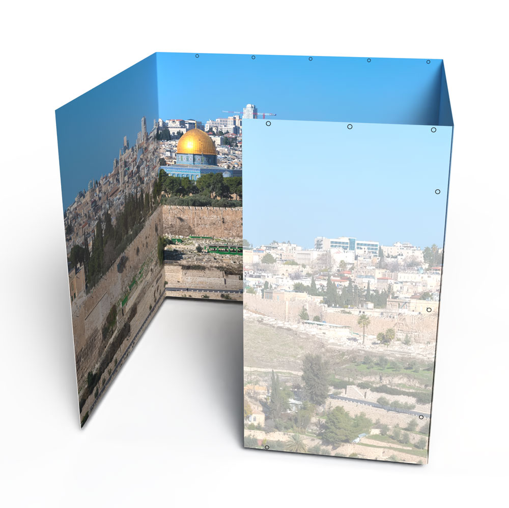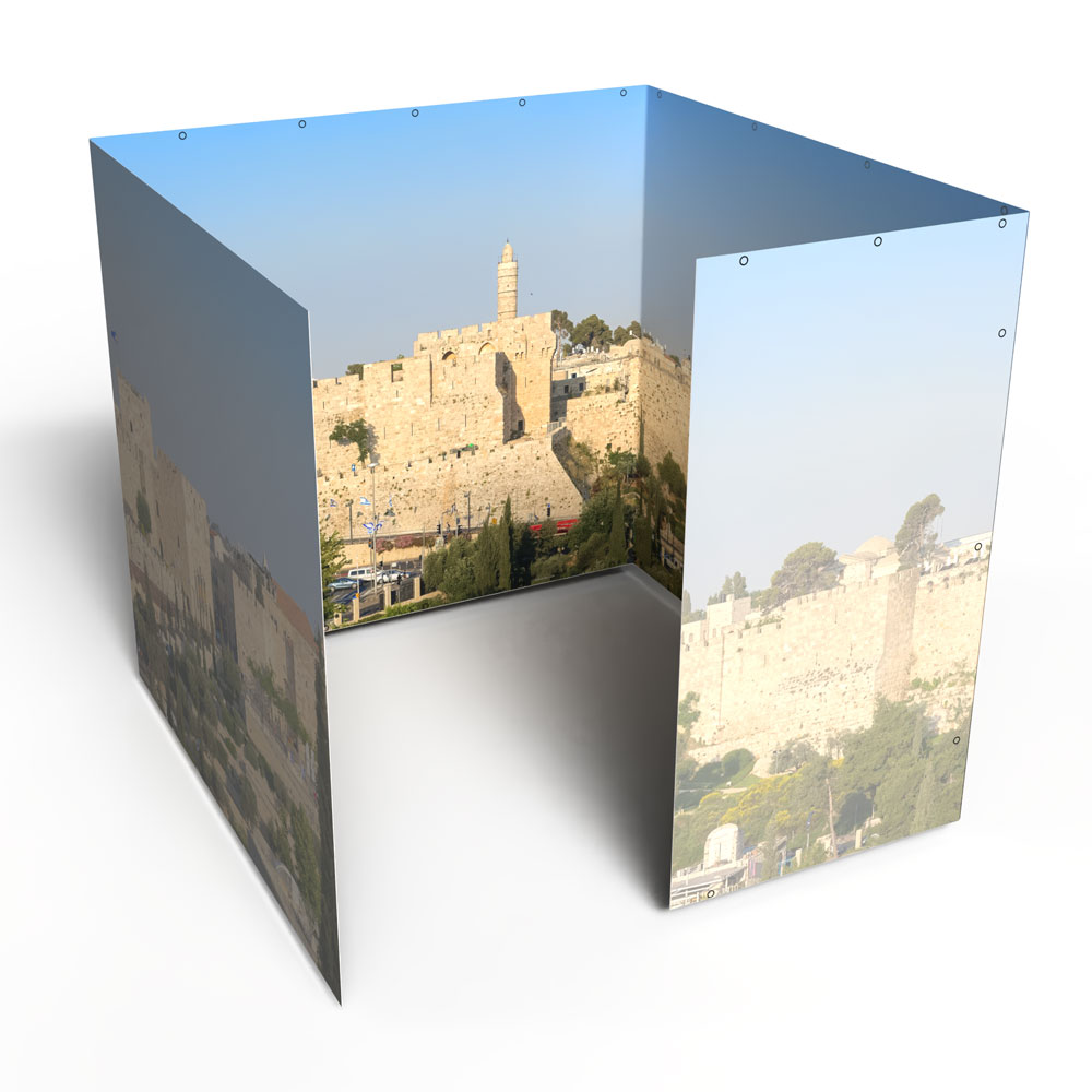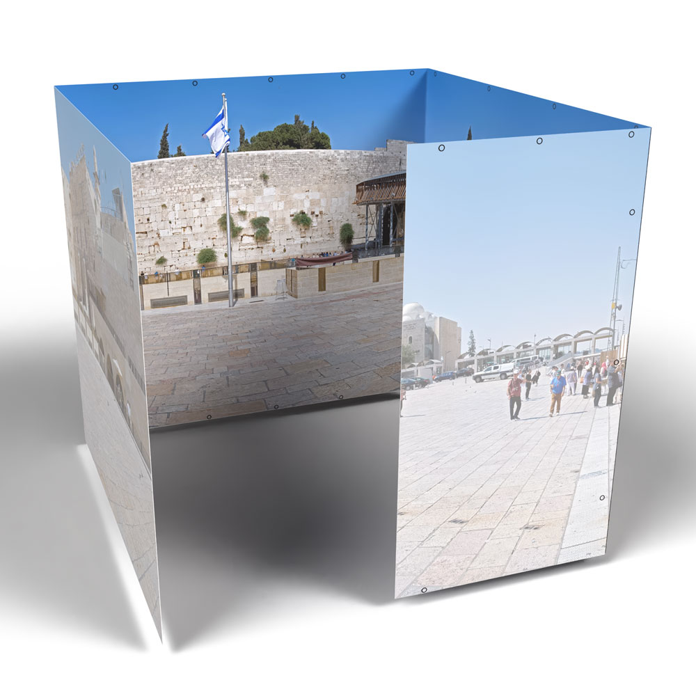 Ready to upgrade your sukkah walls and spend your Sukkot immersed in an Israeli vista of your choice? If you already own an 8×8 Sukkah Project® tubular metal sukkah frame and want to make it even more beautiful with Panoramic Sukkah walls, you’ve come to the right place!  Please note, this product includes the Panoramic Sukkah walls ONLY for an 8×8 Sukkah Project® tubular metal sukkah; it does not include the frame, bungees, bamboo roof poles, etc.  If you would like to purchase a full Panoramic Sukkah kit, you can do that here: 8×8 Panoramic Sukkah Kit.