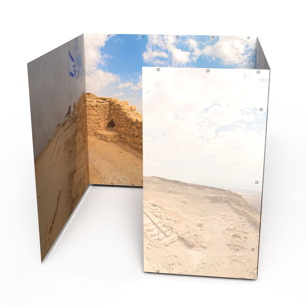 • The Panoramic Sukkah is printed on outdoor banner fabric—a durable, mold-resistant polyester that drapes beautifully and feels substantial and luxurious!