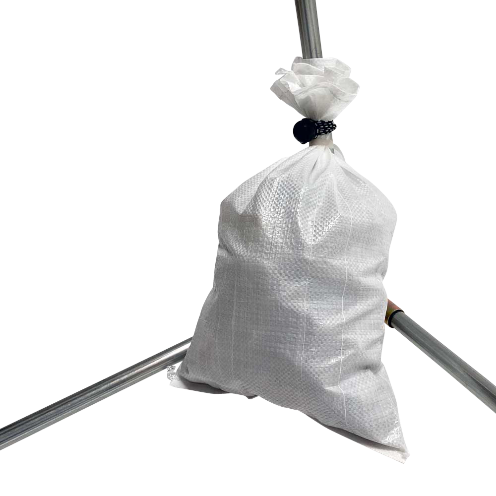 If erected on grass or bare ground, stakes can be driven at each corner and tied to the frame, or sandbags filled with sand or gravel (not included) can be attached to the bottom of each cornerpost. Sandbags can be used on any surface, and are the best alternative on pavement, stone or decks.